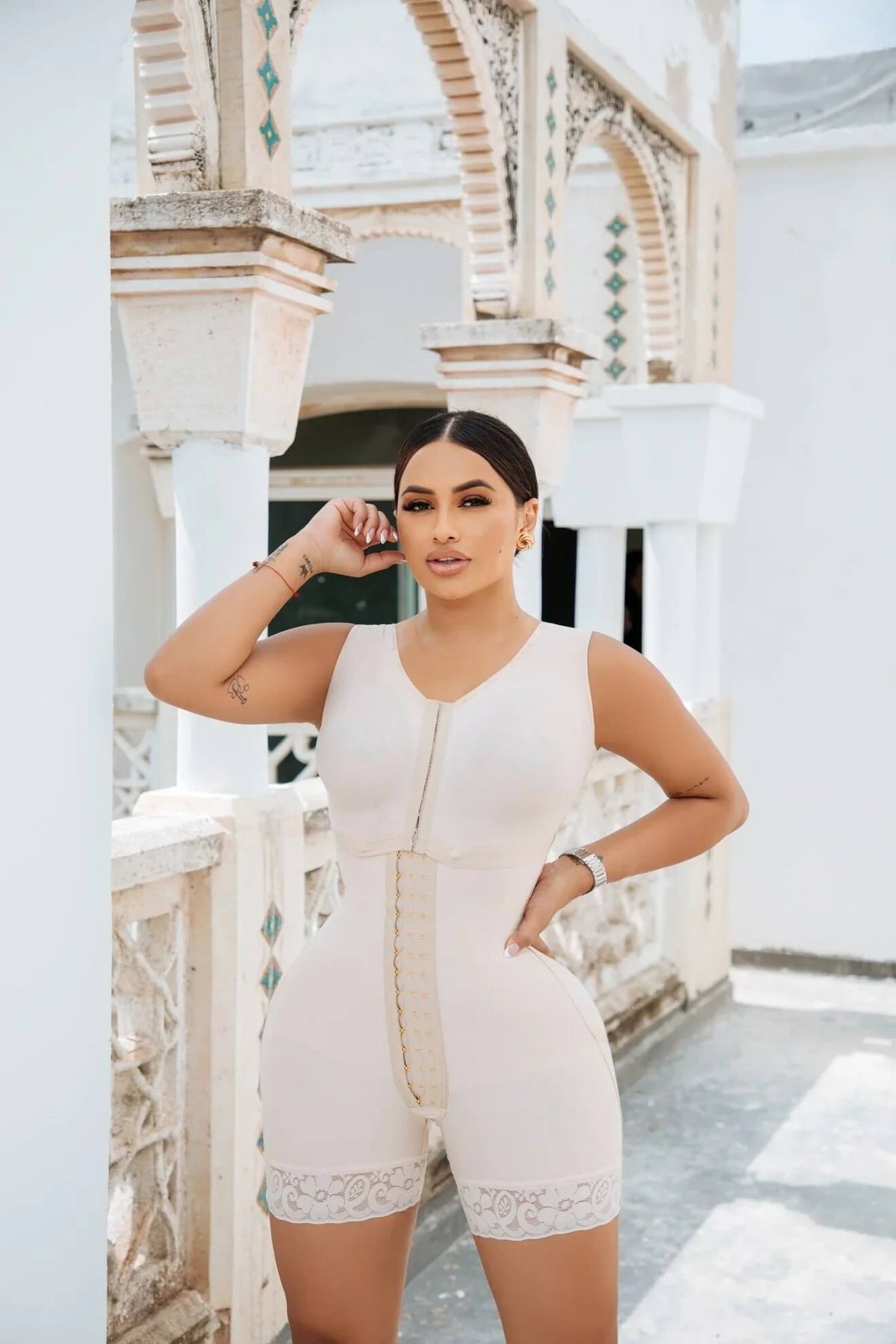Its design is ideal for both daily and post-operative use, offering you coverage and protection from your shoulders to your mid-thigh. It also includes a pre-formed bra for greater coverage and a natural rounding of the bust, which also controls your posture. This wonderful Colombian girdle has triple abdominal reinforcement, making your spectacular waist look much smaller. On the back, you will feel the comfort and natural enhancement of your prominent and rounded buttocks.